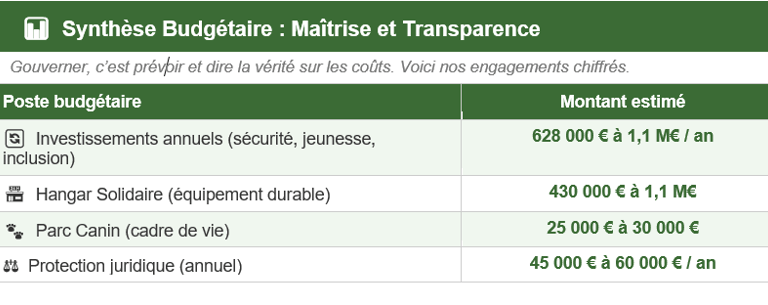Aucun grand projet ne sera lancé sans : (1) une étude précise des coûts réels, et (2) une recherche active de subventions (Région, État, Europe) pour limiter la part payée par les Hautmontois. Notre vision est celle d’une ville protectrice, sobre et innovante.